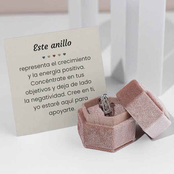 Este anillo representa el crecimiento y la energía positiva. Concéntrate en tus objetivos y deja de lado la negatividad. Cree en ti, yo estaré aquí para apoyarte.