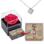 Regálale un elegante collar empaquetado en una elegante caja de regalo con una embriagadora rosa roja. Con su diseño sofisticado y su mágica fragancia de rosas, esta caja creará un momento inolvidable y expresará su afecto de la manera más singular.