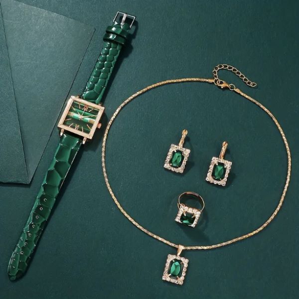 Este elegante conjunto incluye relojes de cuarzo vintage de aguja cuadrada en llamativos tonos verdes, complementados con un deslumbrante juego de joyas de strass, que te permitirán tanto elevar tu propio estilo como compartir la elegancia con tus seres queridos. 🎁⌚💚