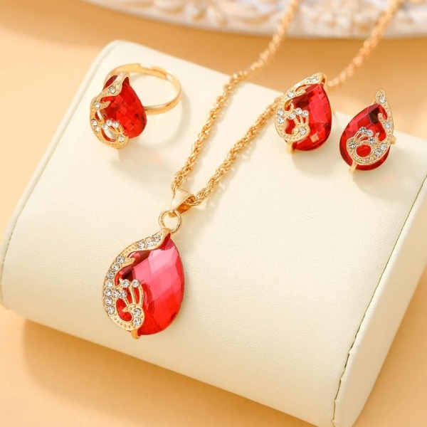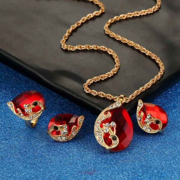 El elegante juego de complementos rojos incluye un reloj de mujer, una pulsera, pendientes, un anillo y un collar; todos ellos fabricados con materiales de calidad. 🎁